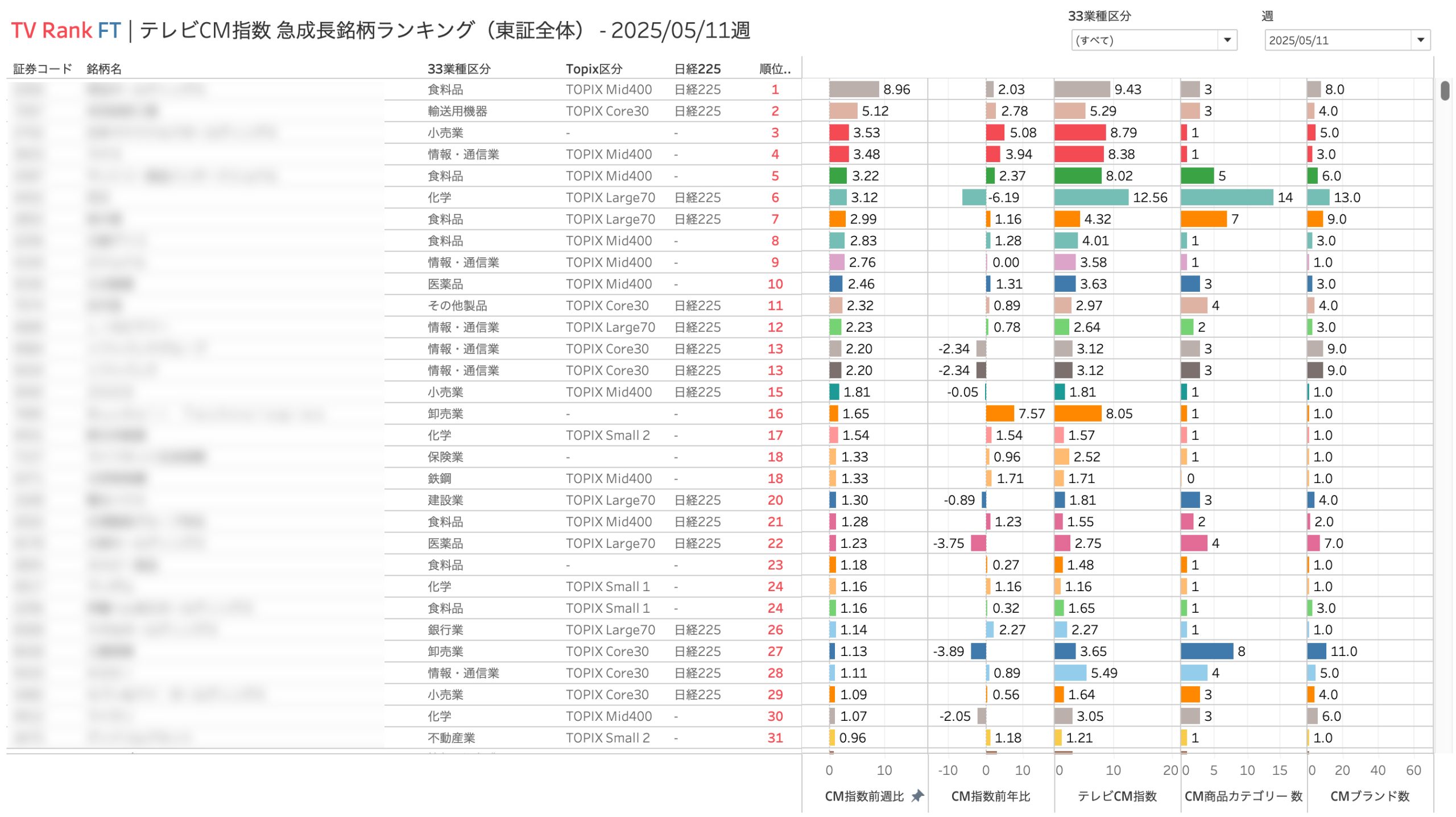 「TV Rank FinTech」ではこの他にもセクター別の銘柄抽出や、銘柄ごとのTV-CM投下カテゴリーの分析などもできるので、セクター別の評価や銘柄ごとの事業性評価、ポートフォリオ分析にもお使いいただける。たとえば、個々のセクターでの期中の銘柄順位、シェアの変動などは重要な先行情報になるだろう。