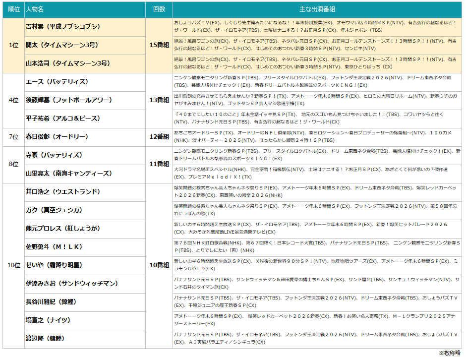 2025年~2026年の年末年始TV番組出演ランキングを発表