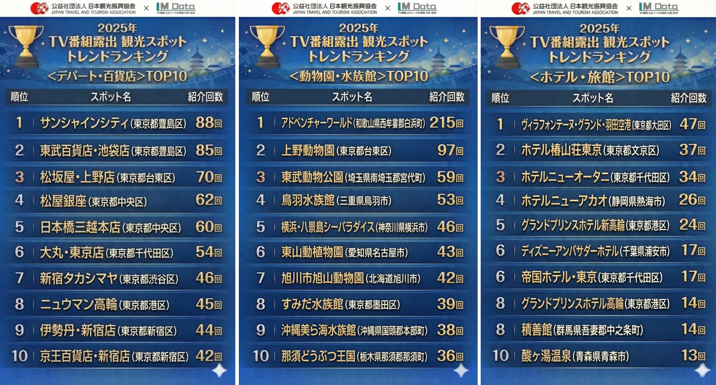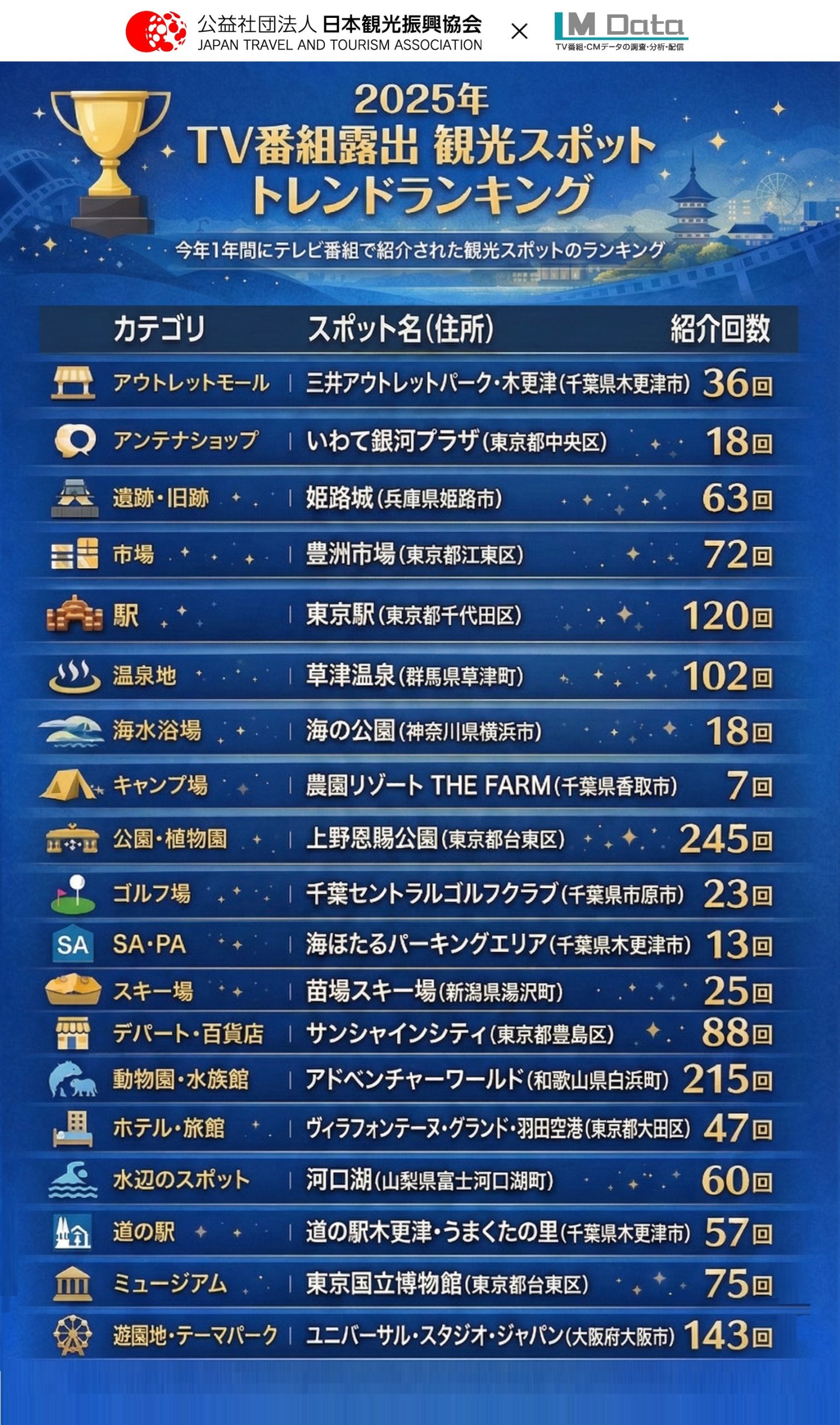 本調査は、エム・データが生成・保有するテレビの放送内容をテキスト化した「TVメタデータ」を活用し、特に観光振興や観光資源に関するスポットや施設に焦点を当て、その放送回数に基づいた年間ランキングをカテゴリ別に集計・分析することで、2025年のテレビ放送を通じて、1年間の日本の観光の世相を振り返るとともに、各地域の観光振興につながるデータを明らかにするものです。ランキングは、以下の通りです。