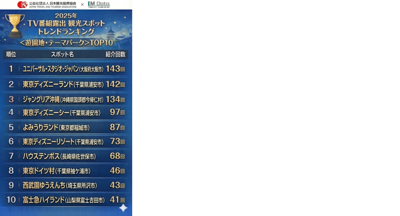 株式会社エム・データ(本社:東京都千代田区、代表取締役社長:薄井司、以下、エム・データ)と、公益社団法人日本観光振興協会(本部:東京都港区、会長:菰田 正信(三井不動産株式会社代表取締役会長)、以下、日観振)は協同で、2025年 TV番組露出 観光スポット トレンドランキング、通称「MBT(最もテレビ報道された観光スポット&トピックスの英訳・Most Broadcast Tourism topics on Japanese televisionの略)」を発表いたしました。